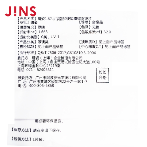JINS睛姿近视眼镜升级1.67非球面普通镜片专用链接