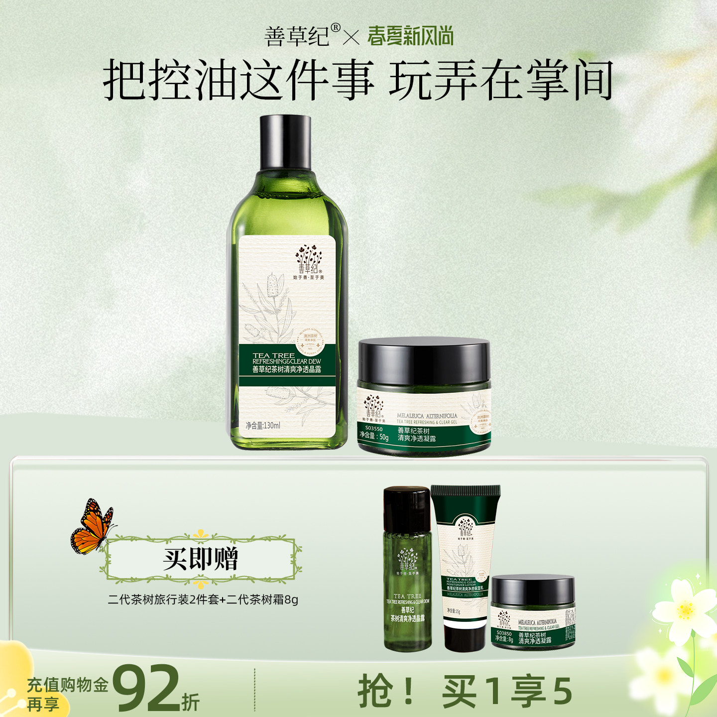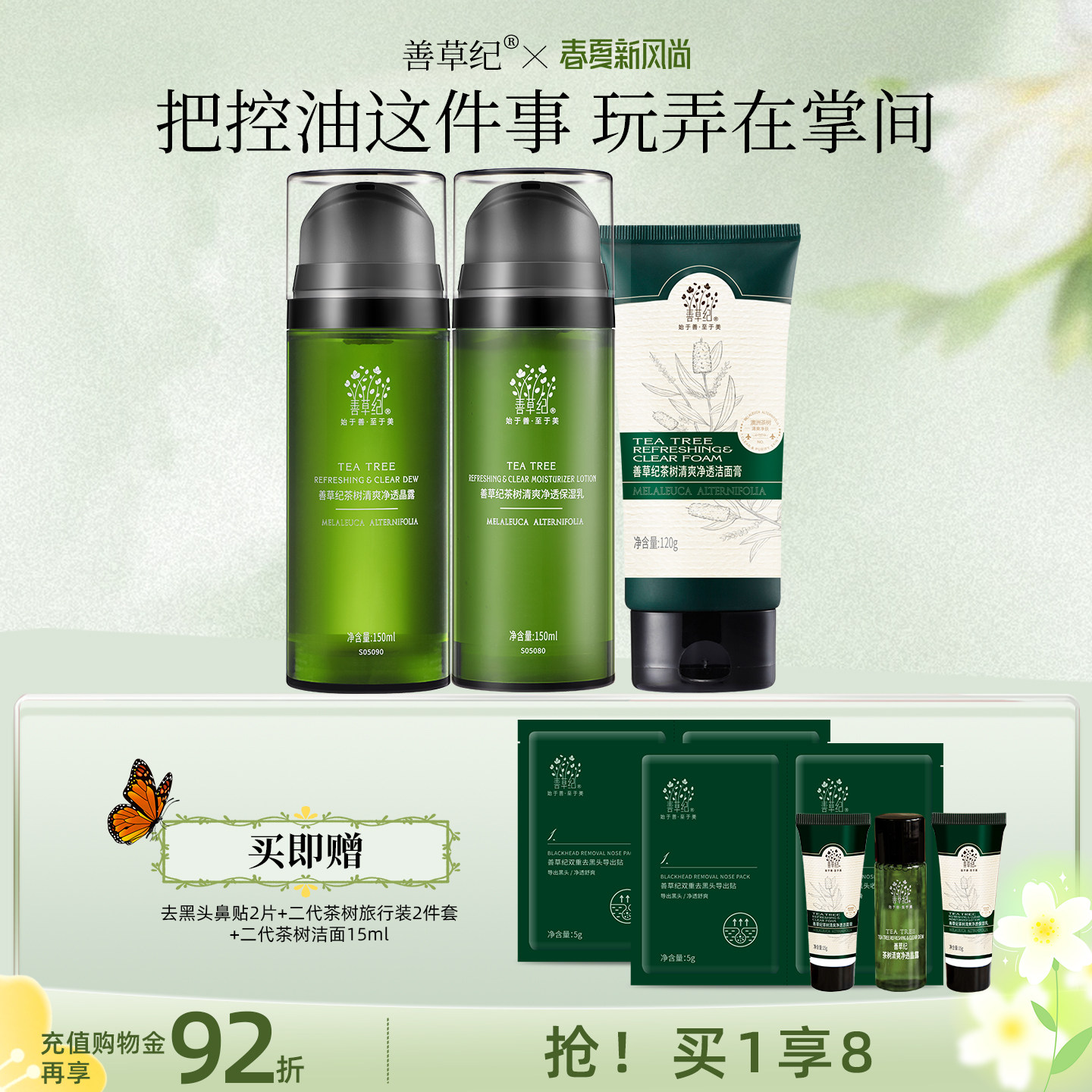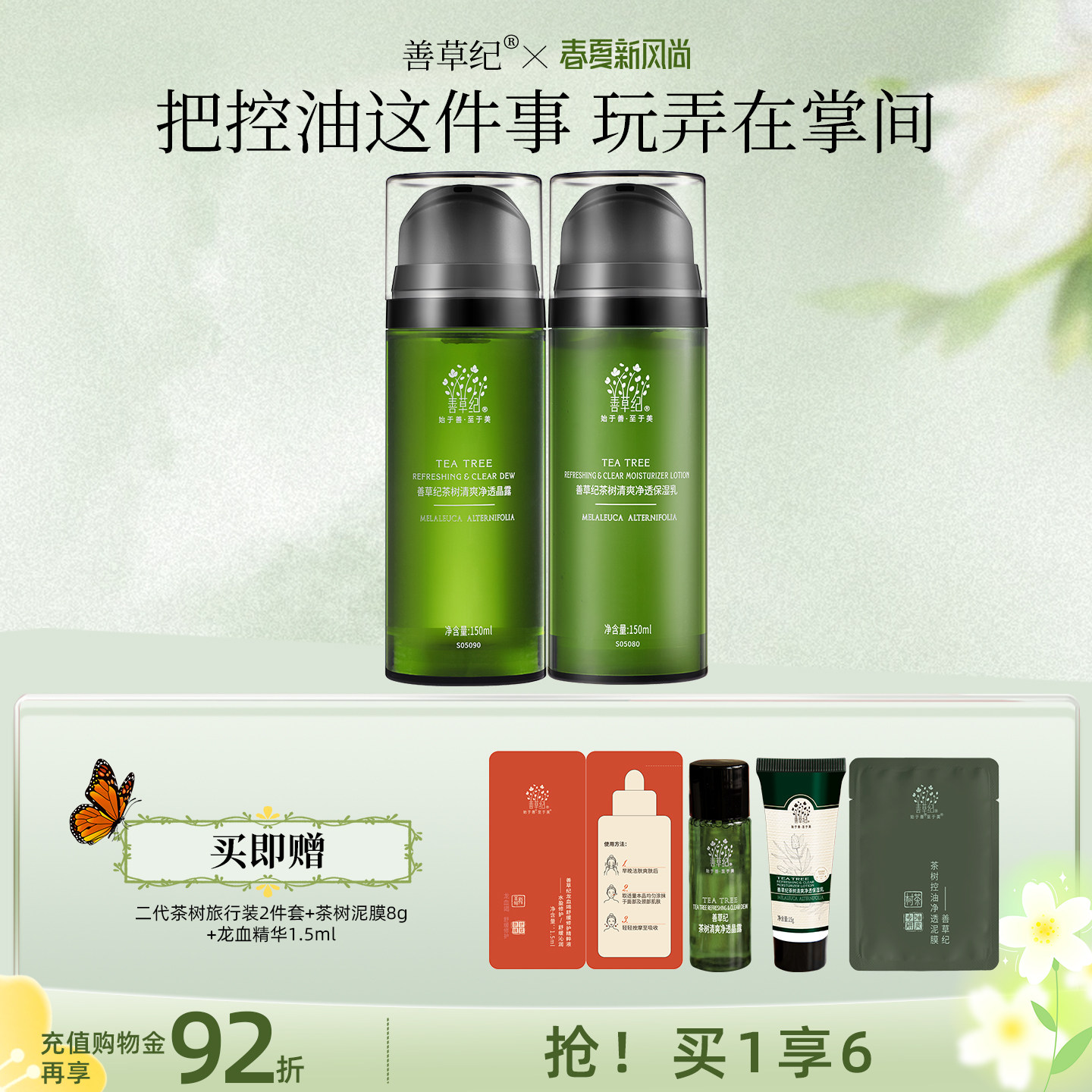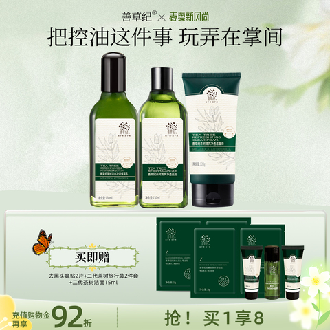 【叠加8.55元超级补贴+14.76元淘金币,凑单叠消费券极限到手98,买就送水乳旅行装+茶树泥膜8g+龙血精华1.5ml】善草纪茶树控油水乳套装油皮油敏肌舒缓控油祛痘双重专利控油,舒缓清爽透气,补水保湿,适合油皮痘敏感肌,舒缓修护清爽祛痘,维护多种油皮失衡问题~