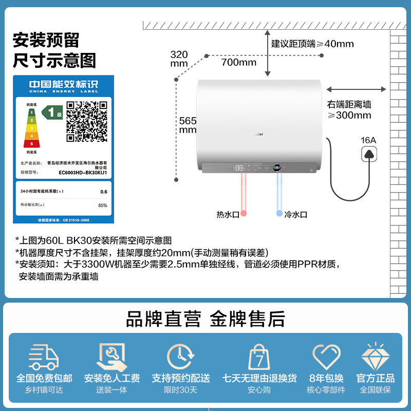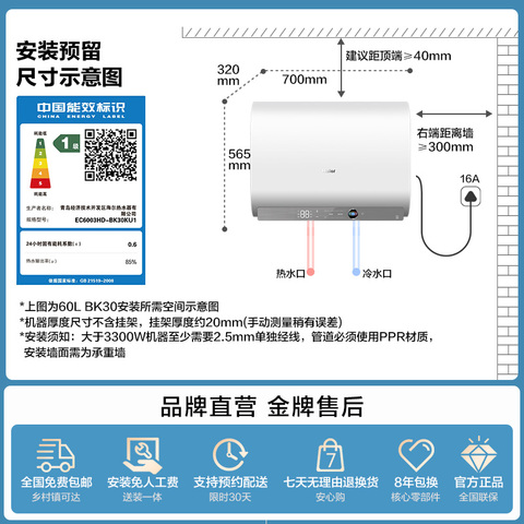 【14日新发】海尔AI电热水器BK30,变频节能,超一级能效,高效恒温,洗澡更舒适!家用,品质保障,限时抢购!